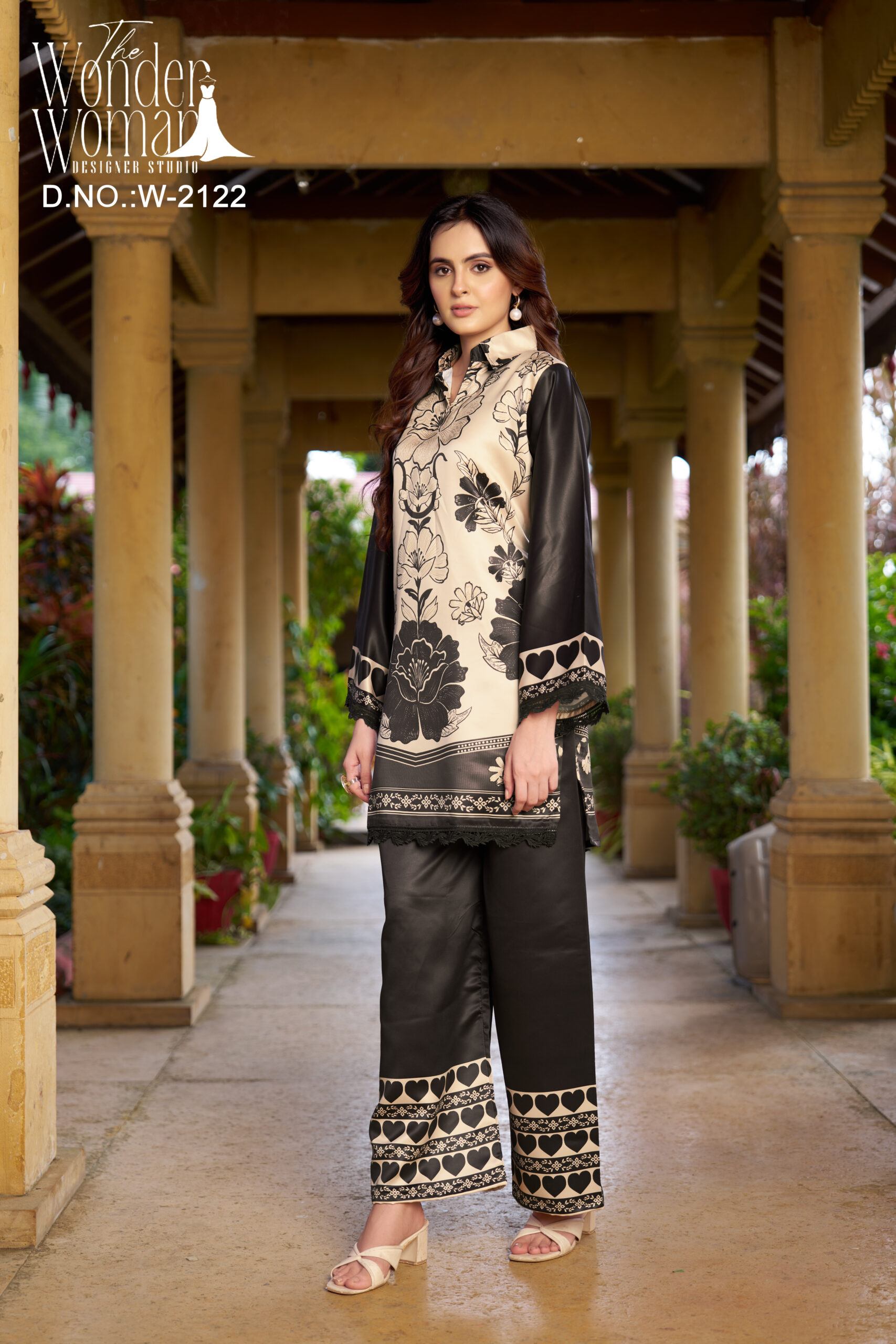 A stunning black and beige floral printed cord set featuring a straight-cut kurta with intricate lace detailing on the hem and sleeves. The matching wide-leg pants are beautifully designed with heart-patterned borders for a chic and modern appeal.