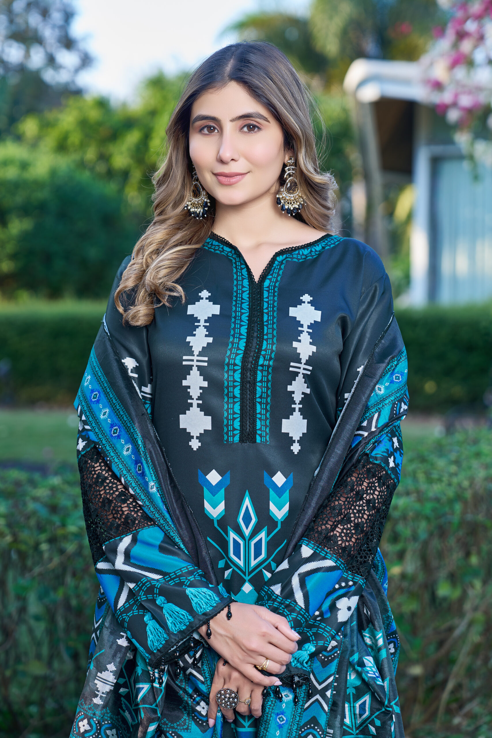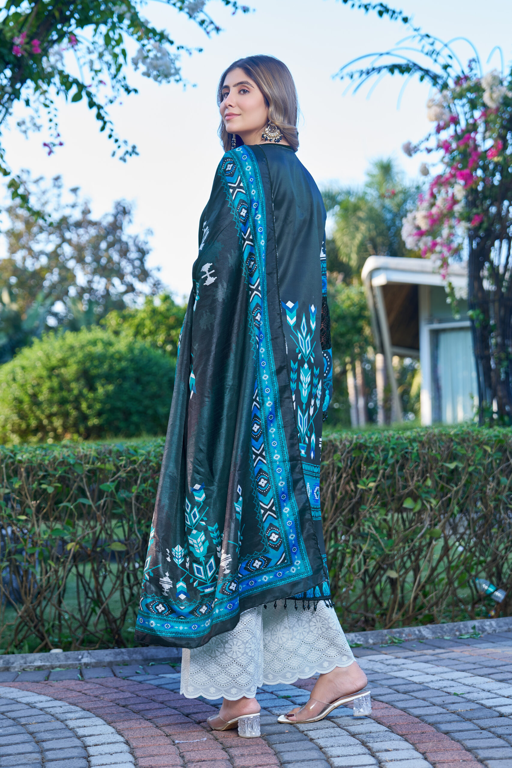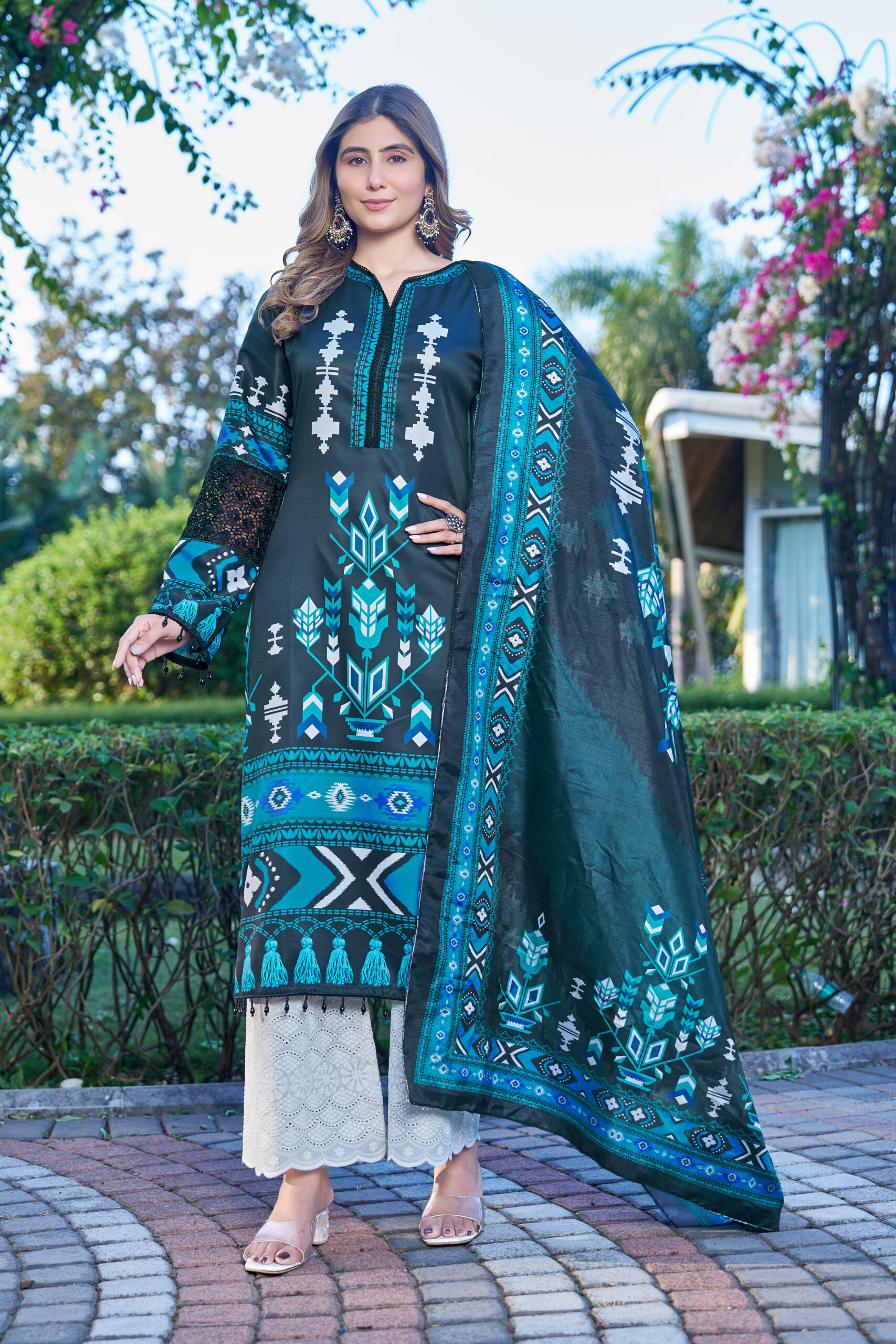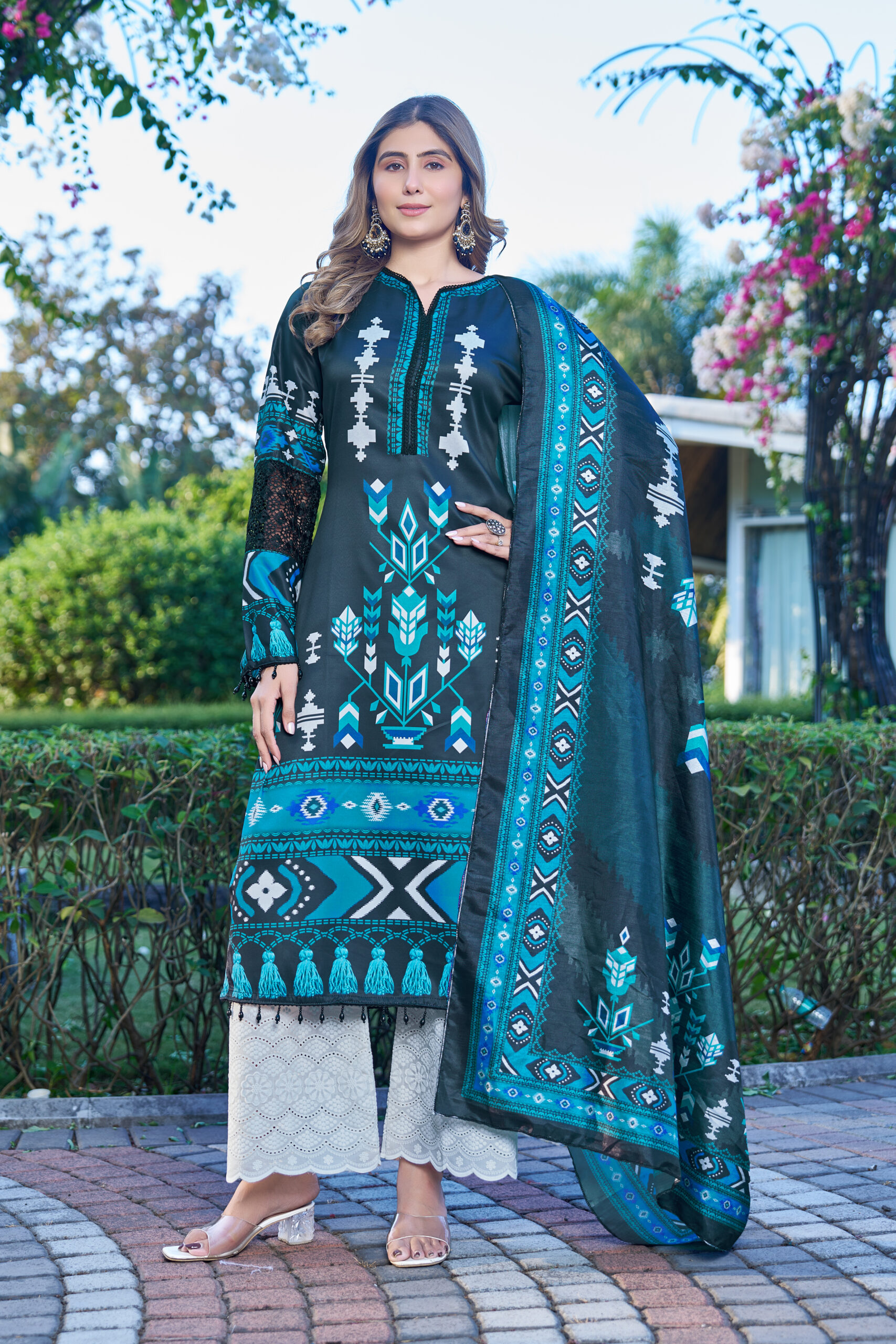 Premium Cotton Satin top with elegant prints, paired with embroidered Chikankari cambric cotton bottom and a rich Dola Silk dupatta β€” timeless, graceful, and effortlessly classy πŸ’™